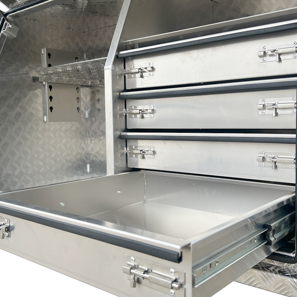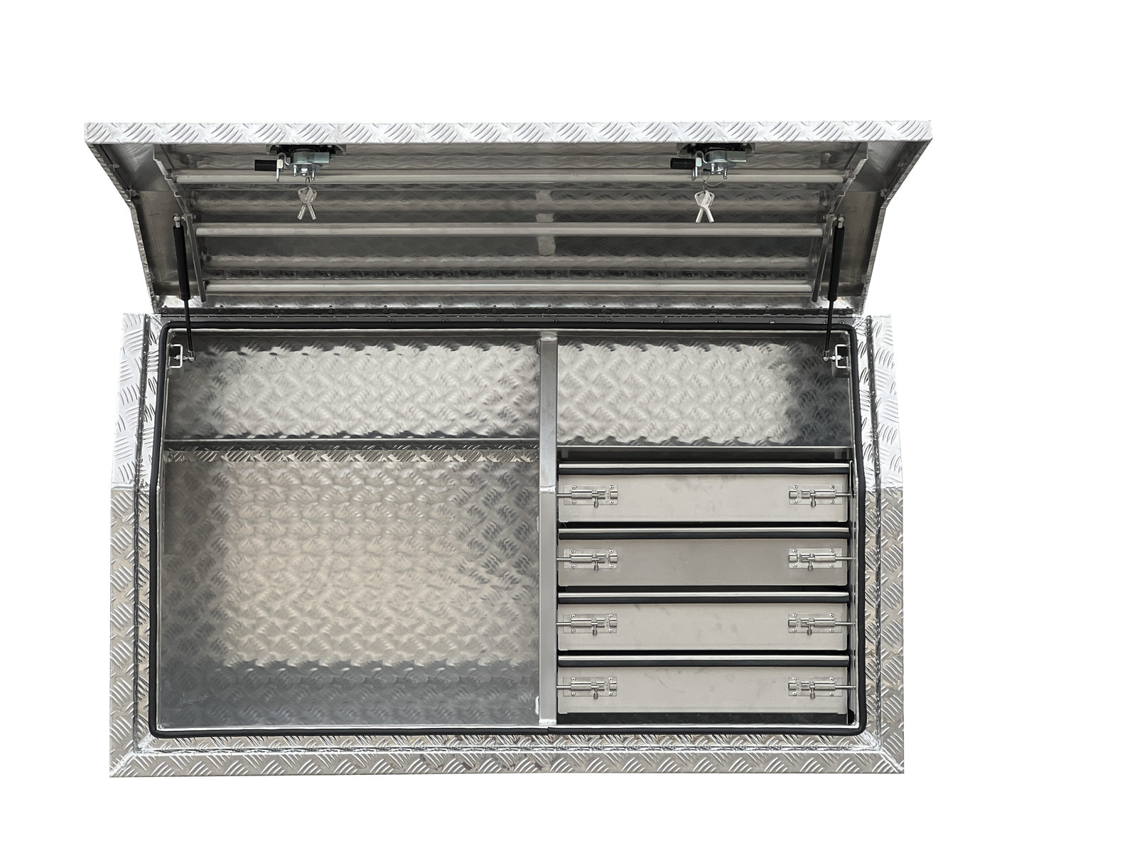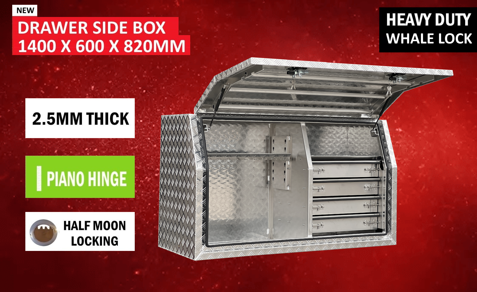 | This is designed to lock up your valuables, The Ute Tool box is hinged with Stainless Steel hinges with a Heavy Duty Whale Tail Lock with Spring Built into the lock to prevent Lock handle becoming lose With the Option to Padlock. Our Boxes are Water/Dust Resistant with Fully welding seams. Our toolboxes are built to the highest quality. Contact us today: 1300 026 937 |