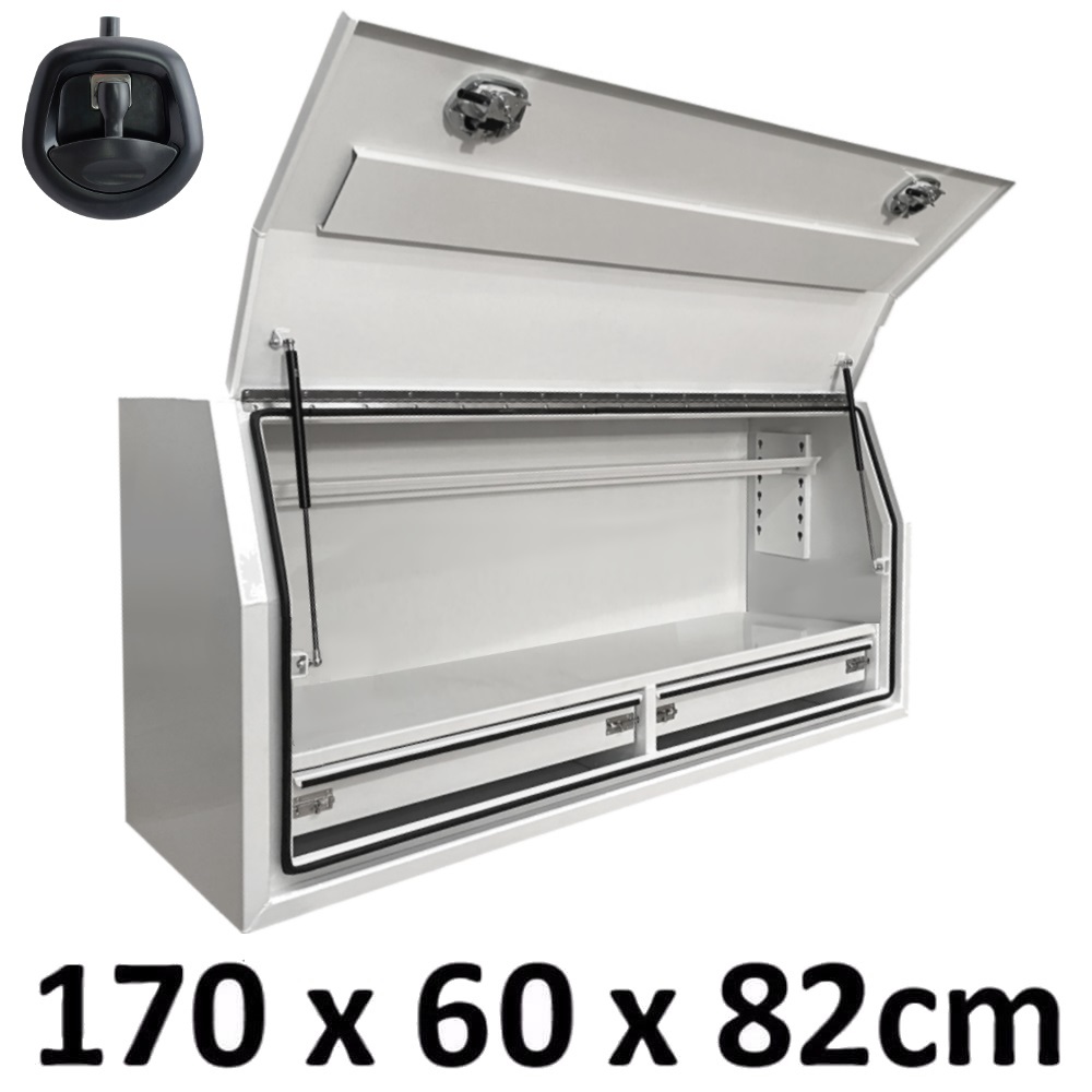 | This is designed to lock up your valuables, The Ute Tool box is hinged with Stainless Steel hinges with a Heavy Duty Whale Tail Lock with Spring Built into the lock to prevent Lock handle becoming lose With the Option to Padlock. Our Boxes are Water/Dust Resistant with Fully welding seams. Our toolboxes are built to the highest quality. Contact us today: 1300 026 937 | |