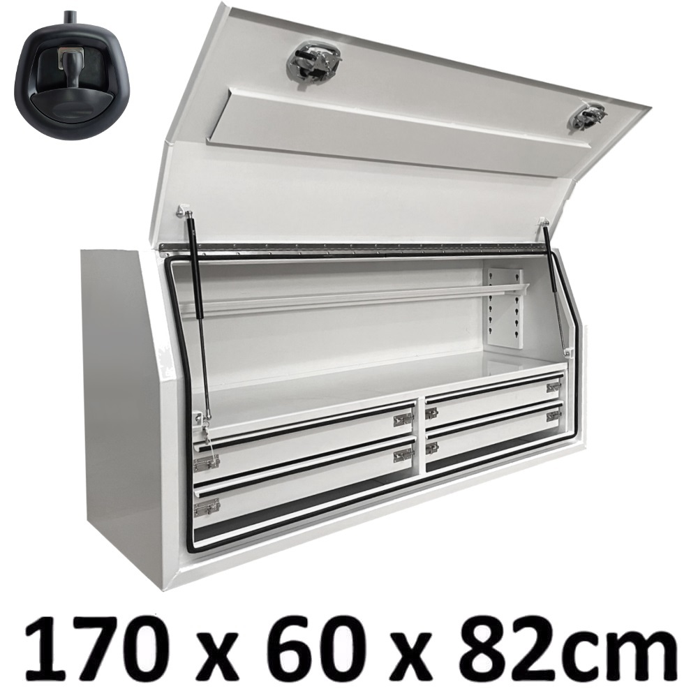 | This is designed to lock up your valuables, The Ute Tool box is hinged with Stainless Steel hinges with a Heavy Duty Whale Tail Lock with Spring Built into the lock to prevent Lock handle becoming lose With the Option to Padlock. Our Boxes are Water/Dust Resistant with Fully welding seams. Our toolboxes are built to the highest quality. Contact us today: 1300 026 937 |