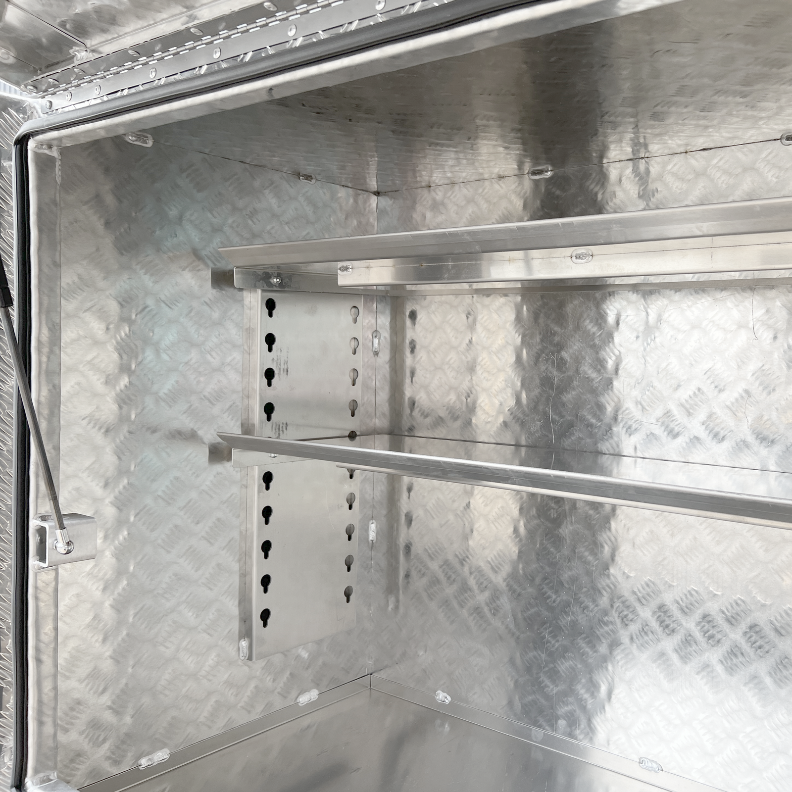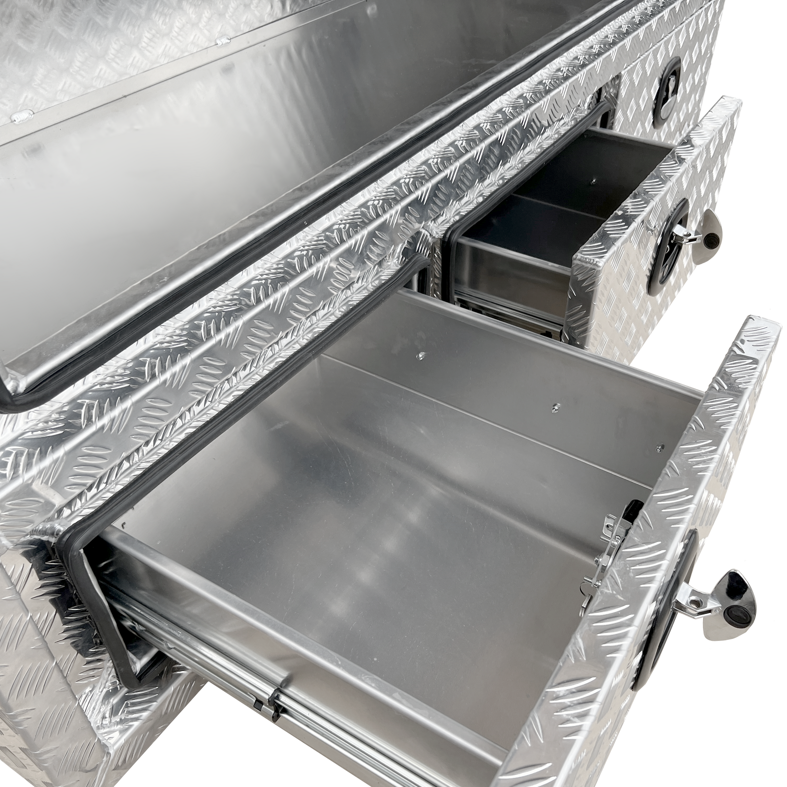 | This is designed to lock up your valuables, The Ute Tool box is hinged with Stainless Steel hinges with a Heavy Duty Whale Tail Lock with Spring Built into the lock to prevent Lock handle becoming lose With the Option to Padlock. Our Boxes are Water/Dust Resistant with Fully welding seams. Our toolboxes are built to the highest quality. Contact us today: 1300 026 937 |