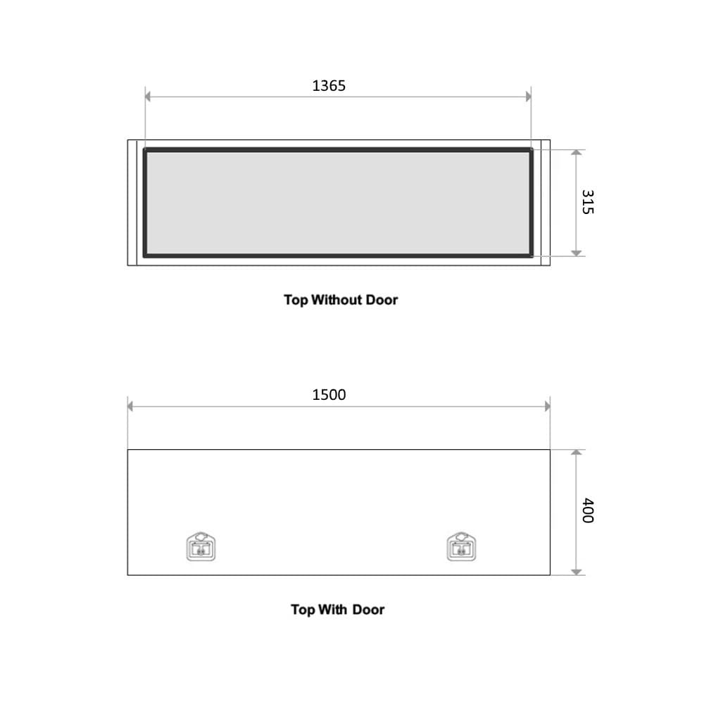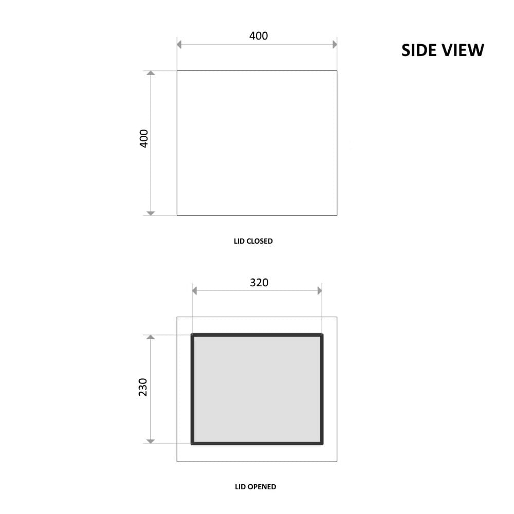 | Opening Sizes: | Top Lid - Length: 1410mm - Height: 315mm Side Lid - Length: 310mm - Height: 250mm |