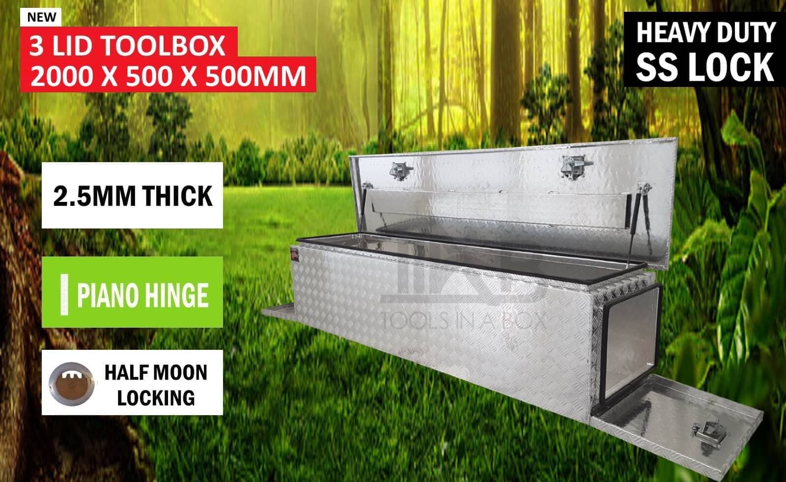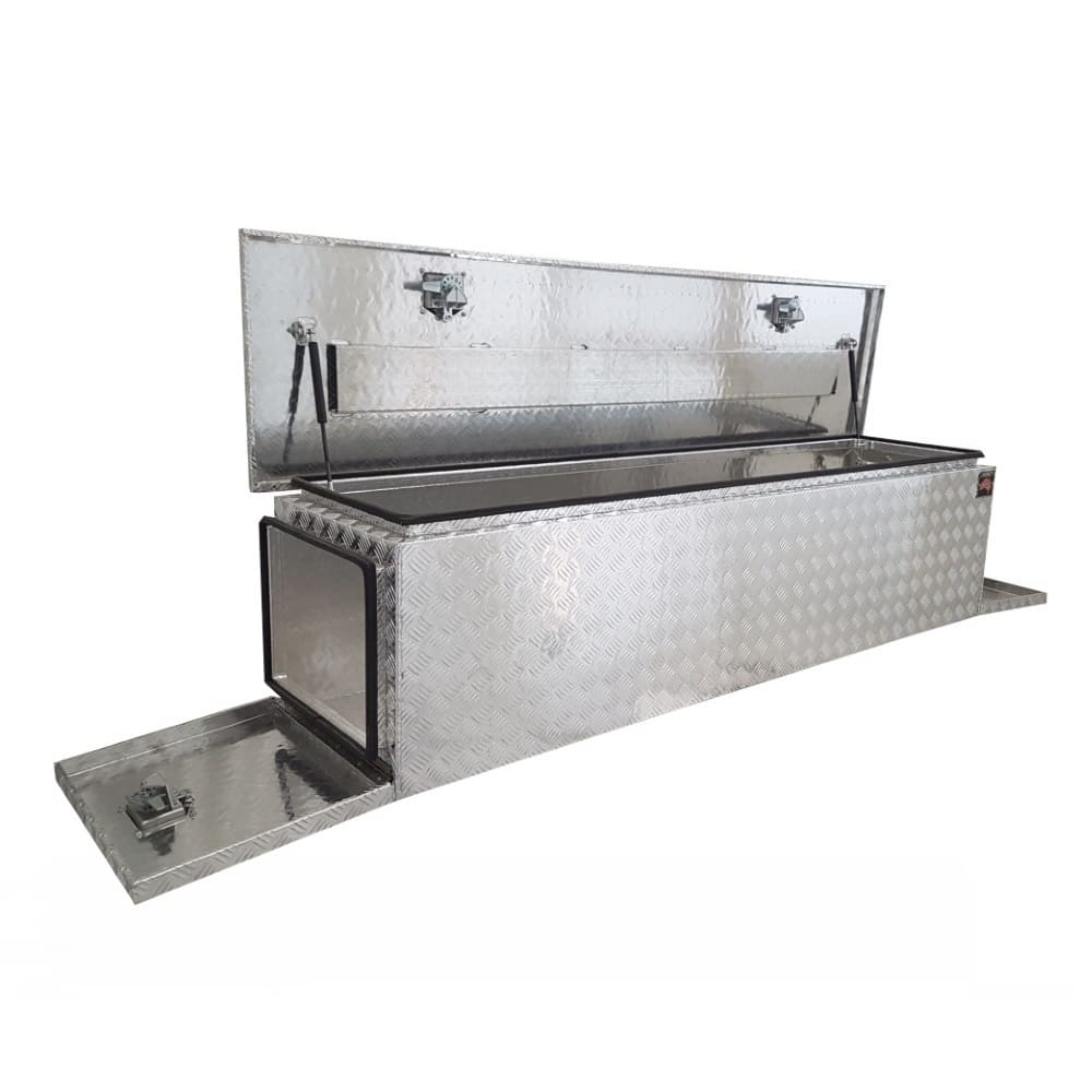 | This is designed to lock up your valuables, The Ute Tool box is hinged with Stainless Steel hinges with a Heavy Duty Stainless T-Locks with Spring Built into the lock to prevent T-Lock handle becoming lose. Our Boxes are Water/Dust Resistant with Fully welding seams. Our toolboxes are built to the highest quality. Contact us today: 1300 026 937 |
