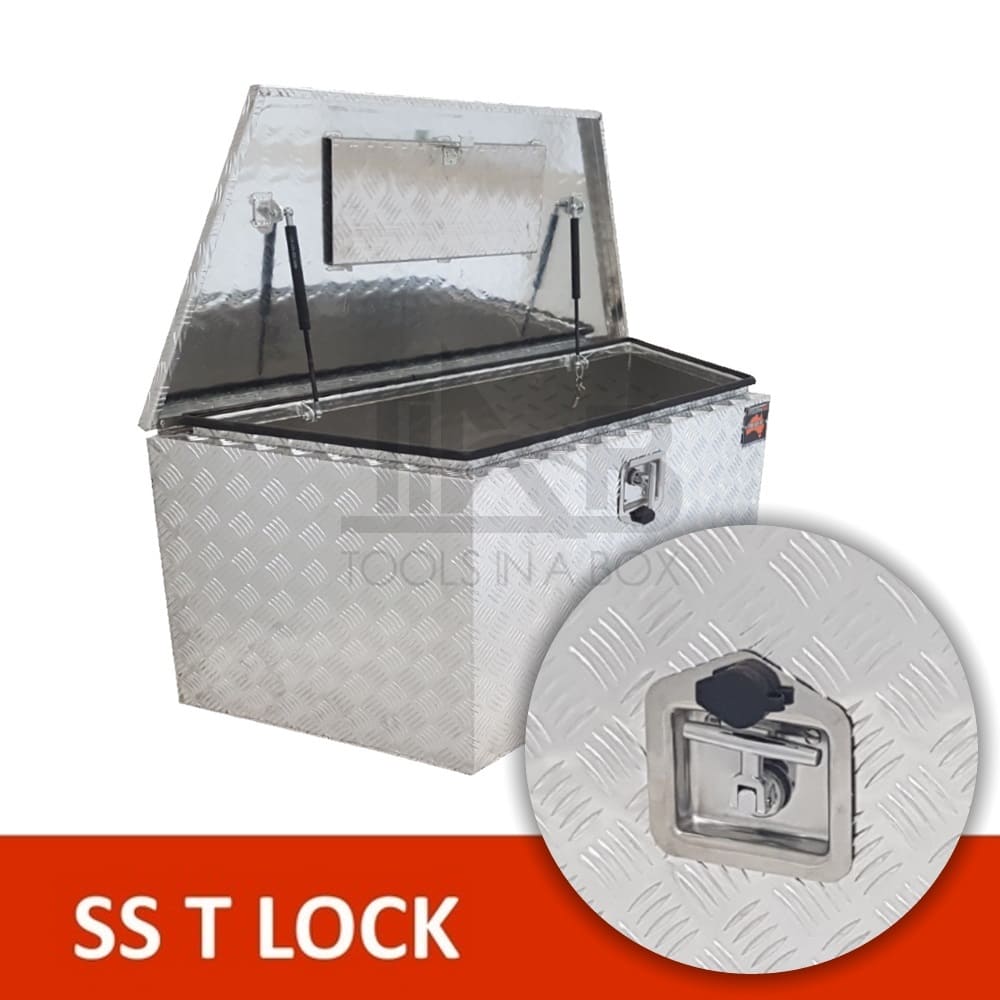 | This is designed to lock up your valuables, The Ute Tool box is hinged with Stainless Steel hinges with a Heavy Duty Stainless T-Locks with Spring Built into the lock to prevent T-Lock handle becoming lose. Our Boxes are Water/Dust Resistant with Fully welding seams. Our toolboxes are built to the highest quality. Contact us today: 1300 026 937 |