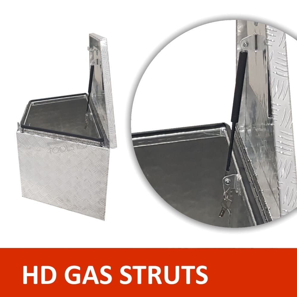 | This is designed to lock up your valuables, The Ute Tool box is hinged with Stainless Steel hinges with a Heavy Duty Stainless T-Locks with Spring Built into the lock to prevent T-Lock handle becoming lose. Our Boxes are Water/Dust Resistant with Fully welding seams. Our toolboxes are built to the highest quality. Contact us today: 1300 026 937 |