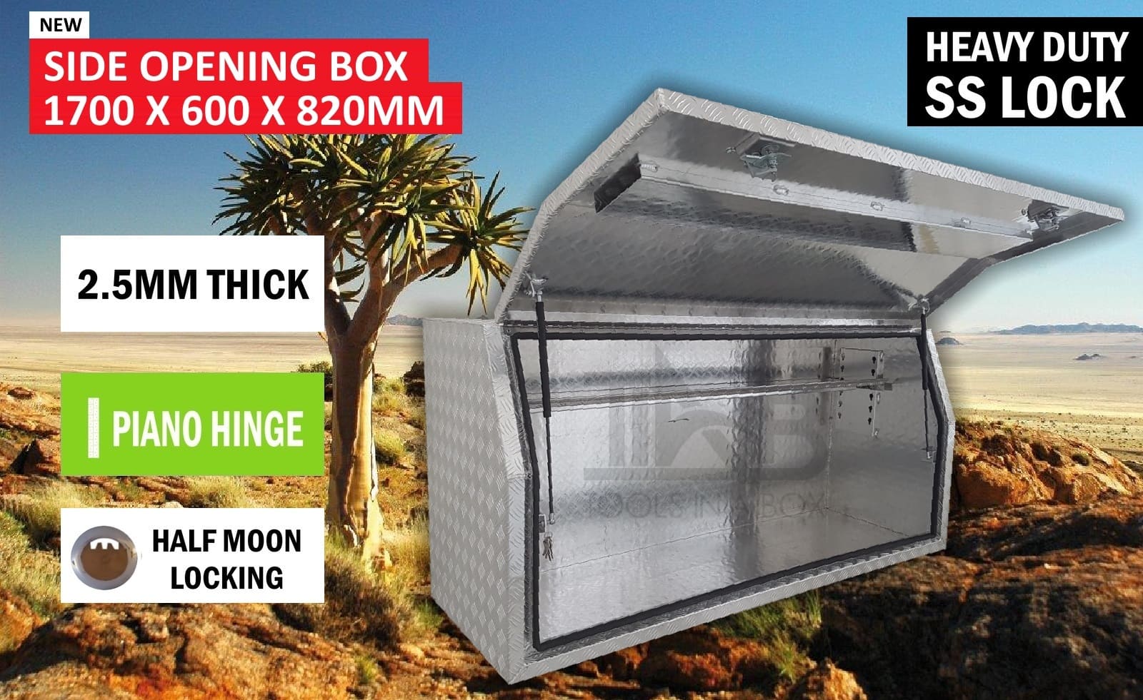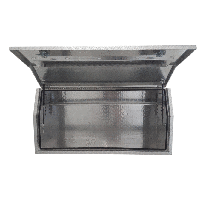 | This is designed to lock up your valuables, The Ute Tool box is hinged with Stainless Steel hinges with a Heavy Duty Whale Tail Lock with Spring Built into the lock to prevent Lock handle becoming lose With the Option to Padlock. Our Boxes are Water/Dust Resistant with Fully welding seams. Our toolboxes are built to the highest quality. Contact us today: 1300 026 937 |