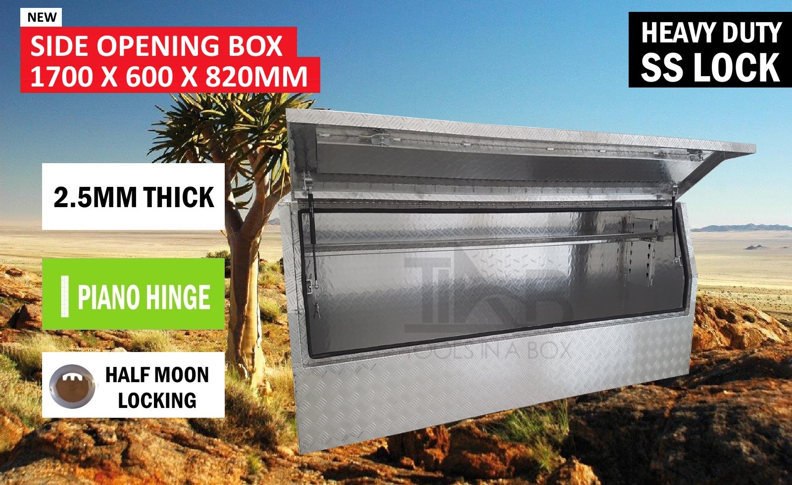 | This is designed to lock up your valuables, The Ute Tool box is hinged with Stainless Steel hinges with a Heavy Duty Whale Tail Lock with Spring Built into the lock to prevent Lock handle becoming lose With the Option to Padlock. Our Boxes are Water/Dust Resistant with Fully welding seams. Our toolboxes are built to the highest quality. Contact us today: 1300 026 937 |
