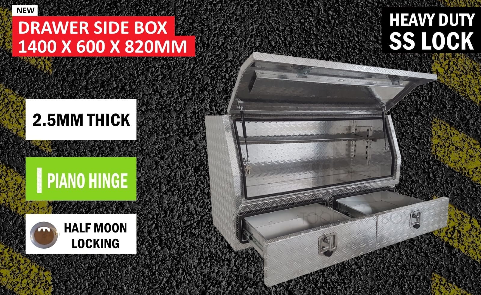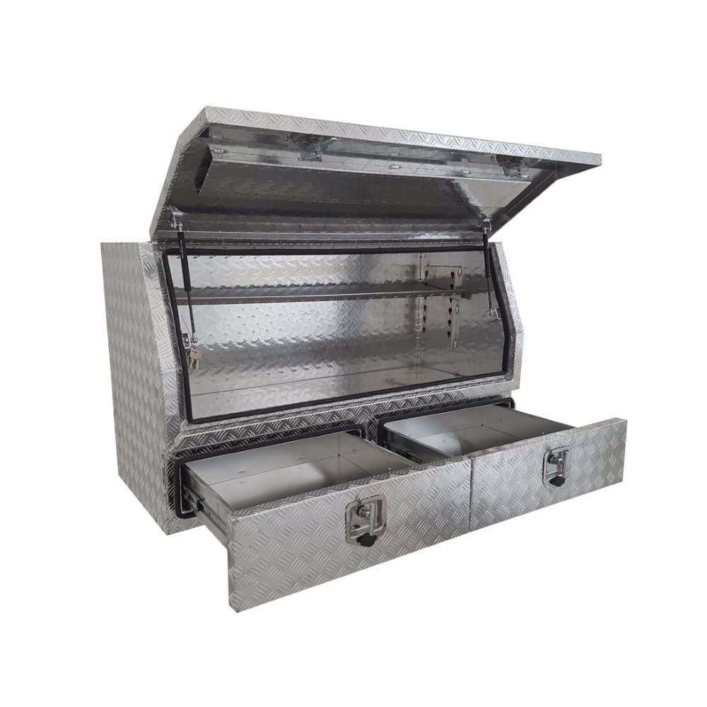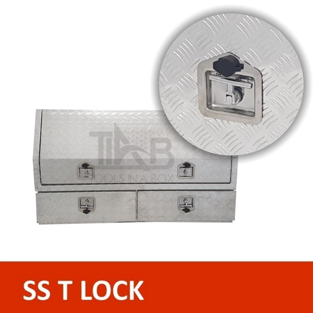 | This is designed to lock up your valuables, The Ute Tool box is hinged with Stainless Steel hinges with a Heavy Duty Whale Tail Lock with Spring Built into the lock to prevent Lock handle becoming lose With the Option to Padlock. Our Boxes are Water/Dust Resistant with Fully welding seams. Our toolboxes are built to the highest quality. Contact us today: 1300 026 937 |
