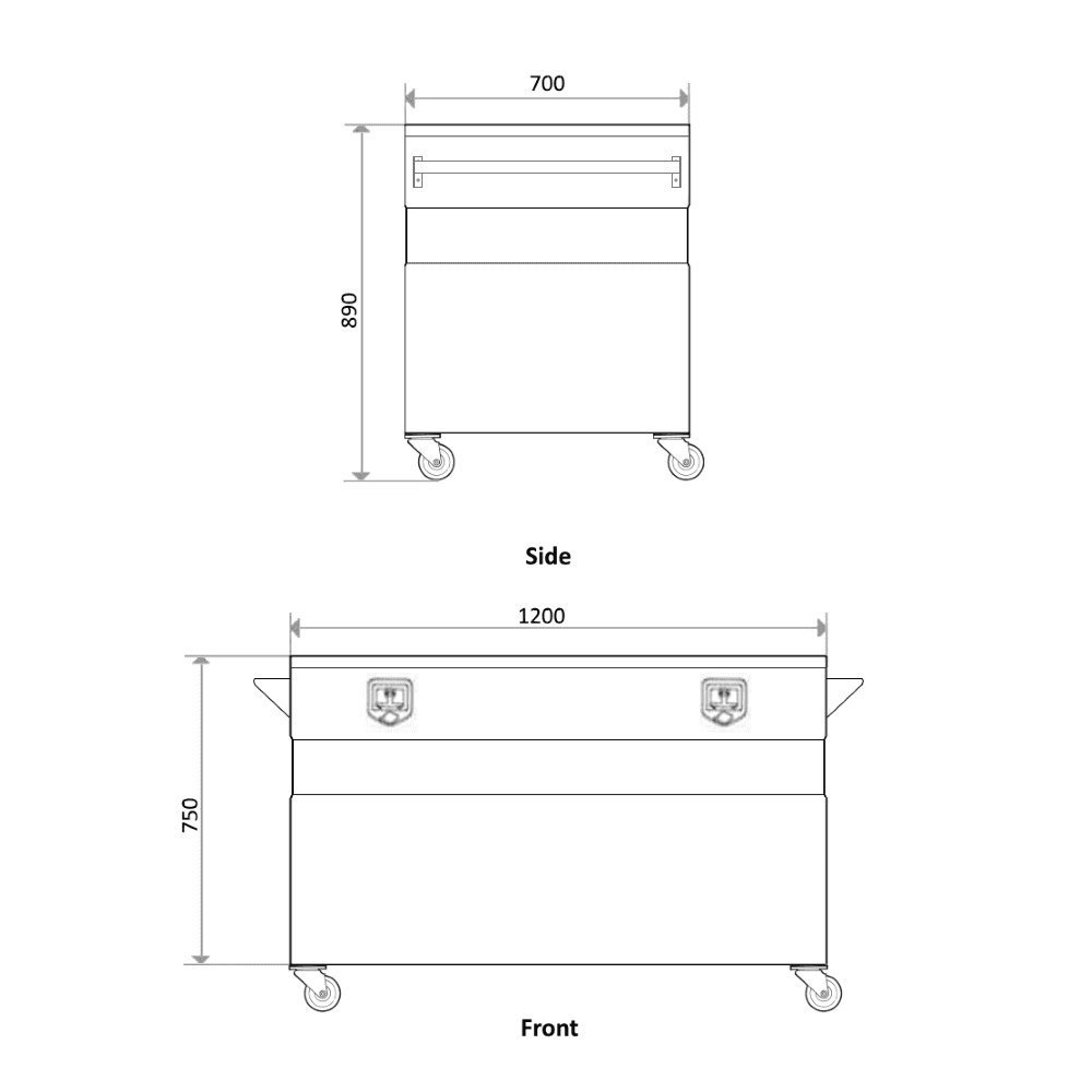 | Box Size: | - Length: 1200mm - Width: 700mm - Height with Heavy Duty 100mm Polly Casters: 890mm - Height without Casters: 750mm |